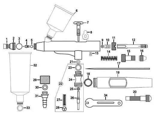 Type: airbrush, tank volume: 0.02 l, action type: double independent, material inlet type: top, maximum nozzle diameter: 0.30 mm, air and ink flow mixing type: internal