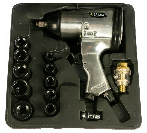 Pneumatic wrench, set of impact sockets: 9, 10, 11, 13, 14, 17, 19, 22, 24, 27 mm, extension 1/2" 125 mm, hexagon 4 mm, oil can without oil, adapter Rapid male, plastic case