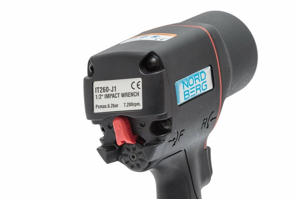 Twin Hammer system; ergonomic handle; air discharge away from the operator and work surface; movable nut; tool dimensions: depth 234 mm, width 206 mm, height 85 mm