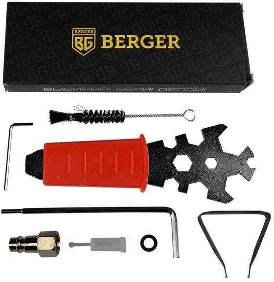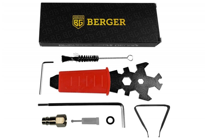Equipment: Tank, adapter-connector from thread F1/4″ to quick-release M1/4″, plastic mini-filter for paintwork materials, set of wrenches for maintenance of the spray gun, brush for cleaning