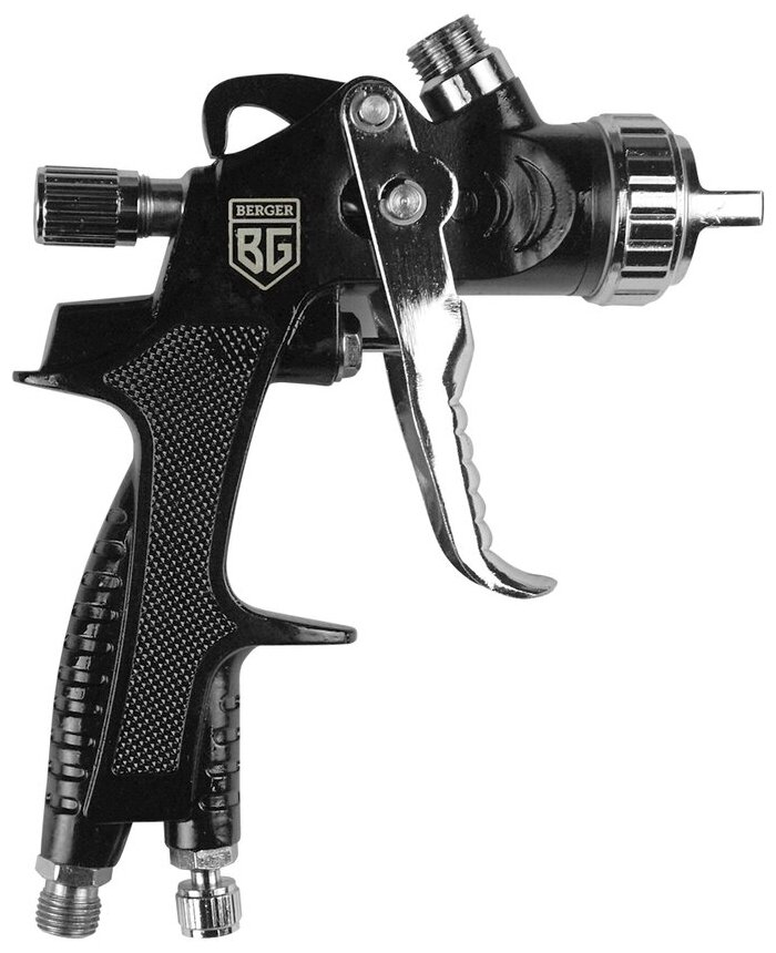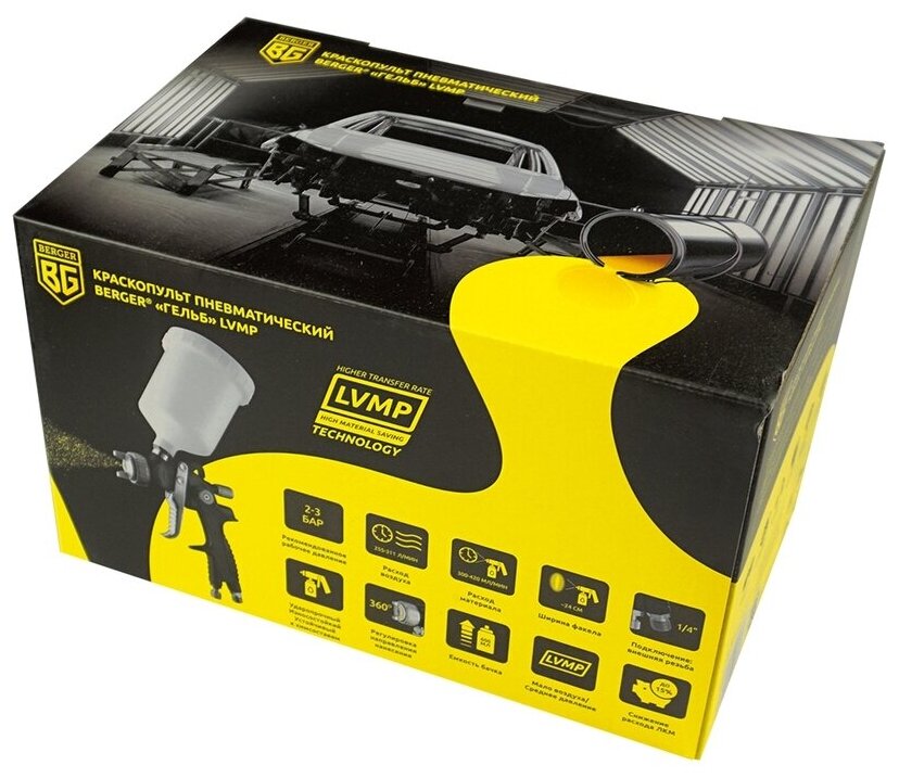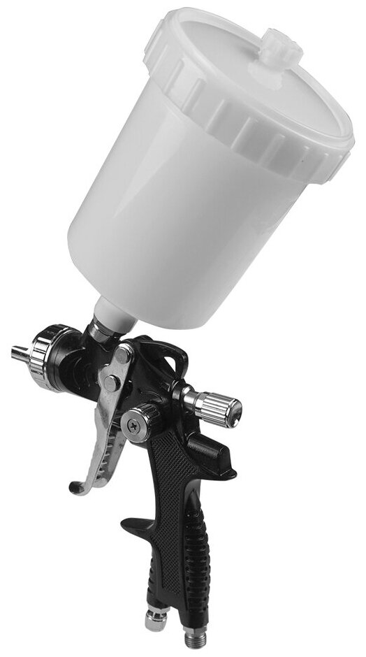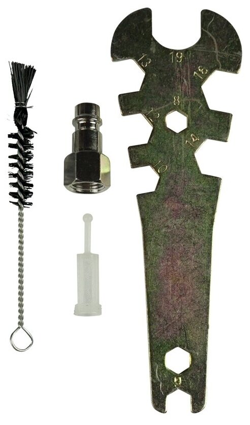 Tank, adapter-connector from thread F1/4″ to quick-release M1/4″, plastic mini-filter for paintwork materials, universal wrench for maintenance of the spray gun, cleaning brush, instruction manual
