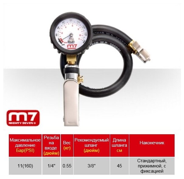 Type: pneumatic gun, purpose: for tire inflation, minimum pressure: 6.30 atm, maximum pressure: 11 atm, air nozzle diameter [inch]: 1/4, weight: 0.55 kg
