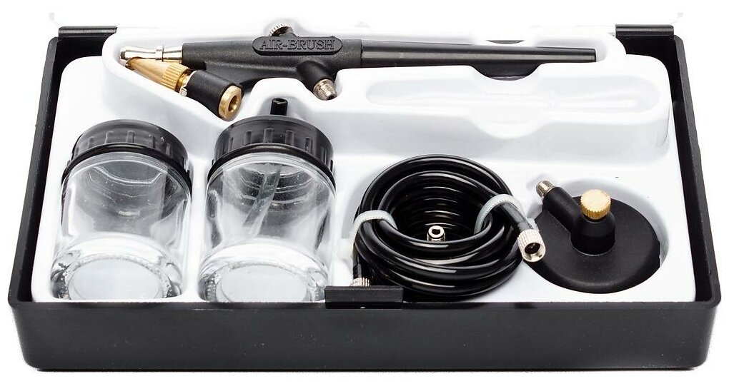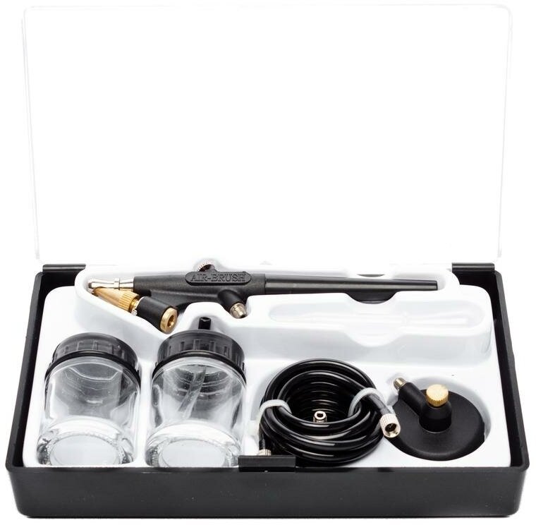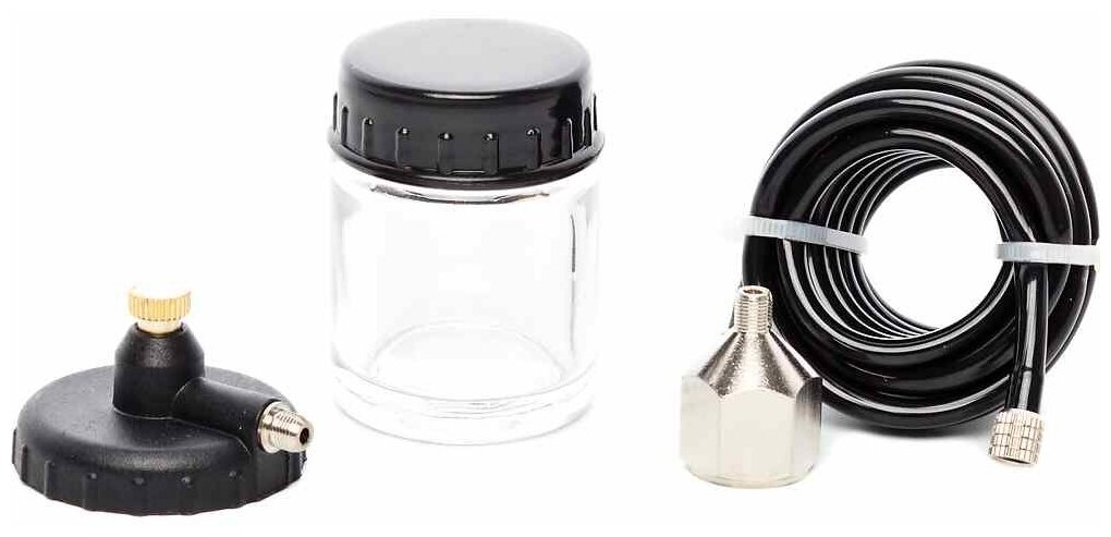 Airbrush, vinyl hose 1.5 m long, glass bottle 22 ml - 2 pcs. wrench, travel adjuster and 1/4" tubing adapter.