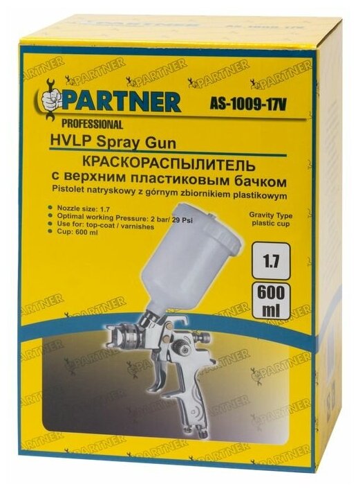 Type: pneumatic spray gun, tank volume: 0.60 l, spraying method: HVLP, maximum nozzle diameter: 1.70 mm