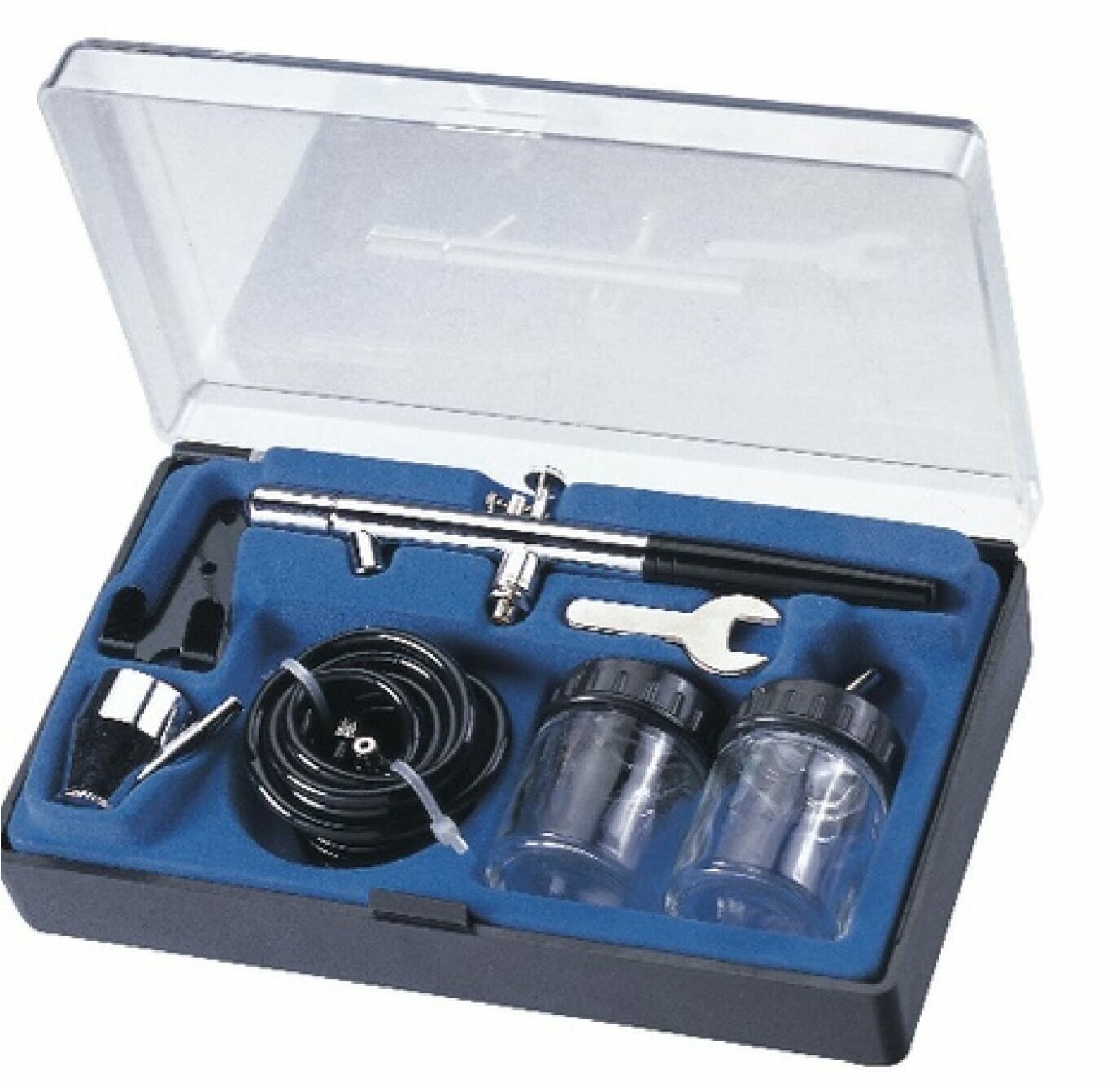 PVC air hose, glass tank 2 pcs, metal tank 5 ml, service key, pipette for removing paint, adapter 1/4'' 5 mm, regulator