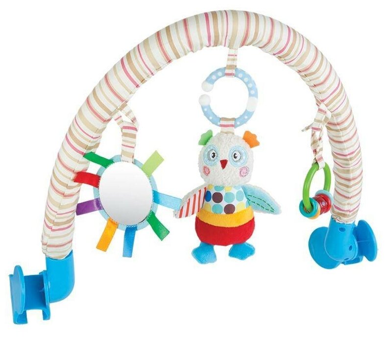 Type: arc, effects: sound, educational elements: mirror, bell, rattle, tactile inserts, material: plastic, textile