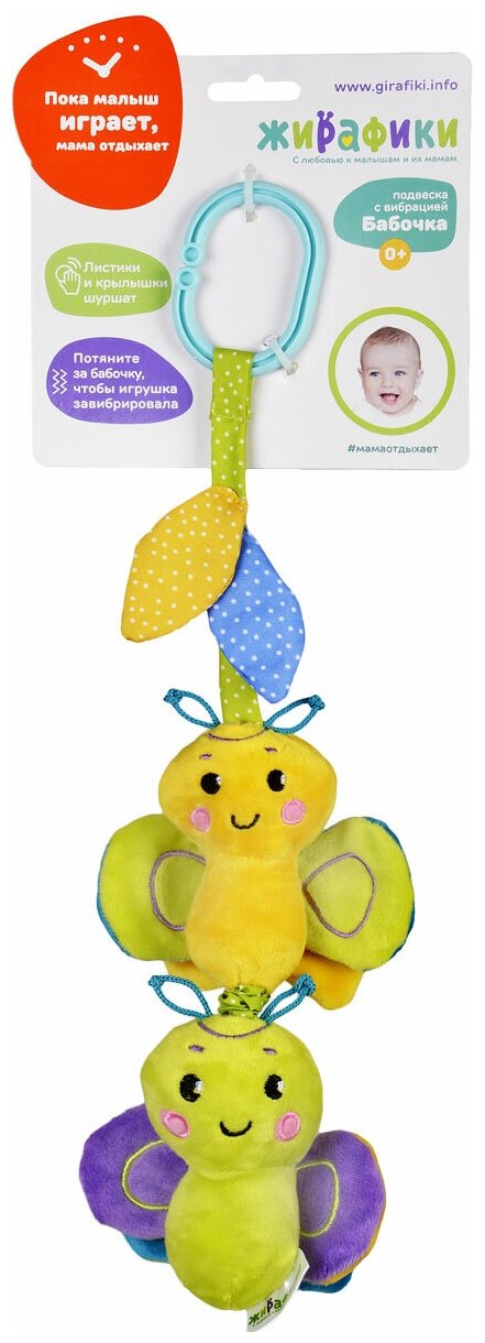 Type: hanging toy, effects: vibration, sound, educational elements: squeaker, tactile inserts, rustling and crunchy elements, material: plastic, textile