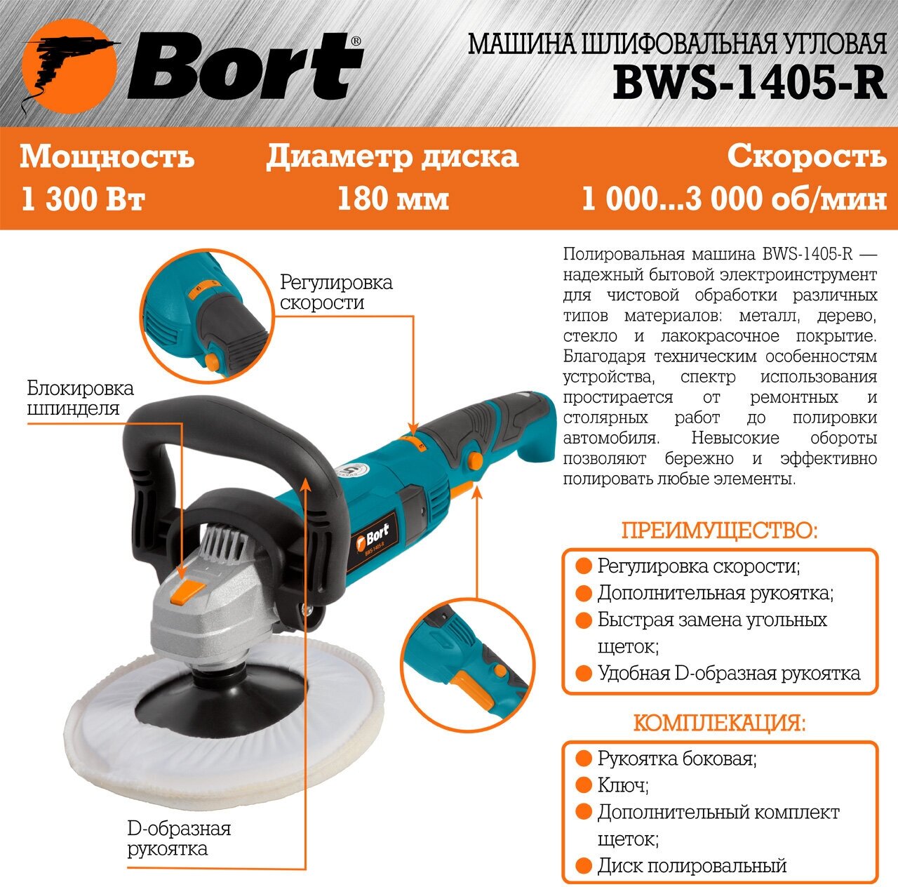 Type of power supply: mains, max. disc diameter: 180 mm, power consumption: 1300 W, functions: speed control, design features: power button lock, additional handle, spindle lock, unit