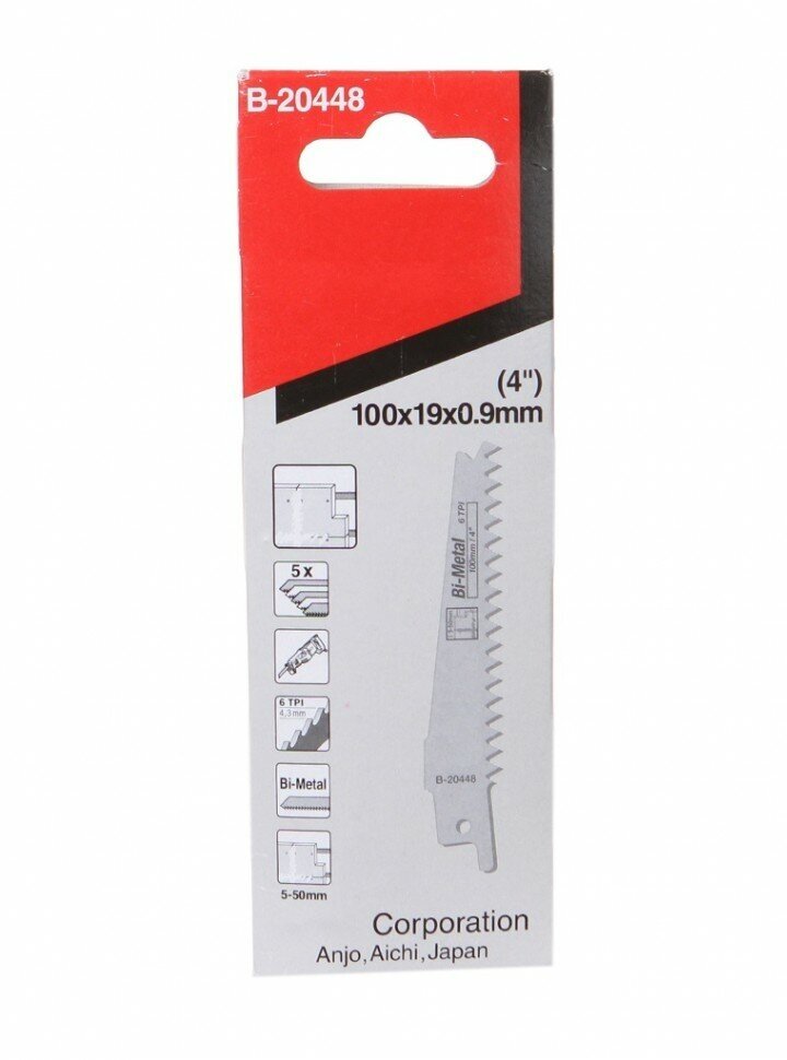 Type: saw blade, purpose: for reciprocating saws, length: 100 mm, blade width: 19 mm, blade thickness: 0.90 mm, production material: bimetallic, processing material: drywall, universal, tooth pitch: fixed
