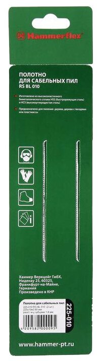 Type: saw blade, purpose: for reciprocating saw, length: 225 mm, blade width: 19 mm, blade thickness: 0.90 mm, production material: bimetal, processing material: wood, metal, tooth pitch: fixed