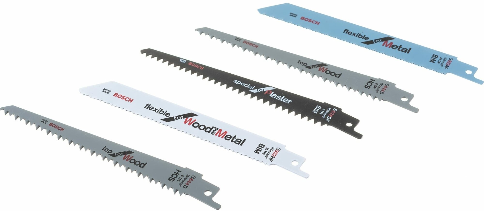 2 blades for wood S644D length 150mm, tooth pitch 4.3mm; 1 metal blade S918A length 150mm, tooth pitch 1mm; 1 drywall blade S628DF length 150mm, tooth pitch 4.3mm; 1 blade for wood and metal S922HF length 150mm, tooth pitch 2.5mm
