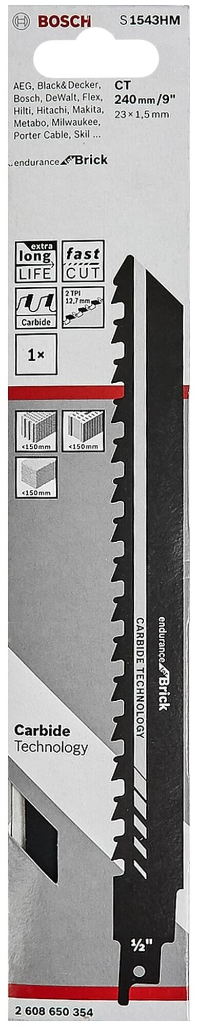Type: saw blade, purpose: for reciprocating saw, length: 240 mm, blade width: 23 mm, blade thickness: 1.50 mm, maximum cutting thickness: 150 mm, production material: high carbon steel, cutting type: fast, material
