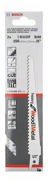 Type: saw blade, purpose: for reciprocating saw, length: 150 mm, blade width: 19 mm, blade thickness: 1.25 mm, maximum cutting thickness: 100 mm, production material: bimetallic, cutting type: fast, material processed