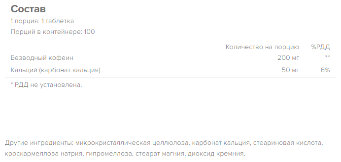 Main ingredients: caffeine, formulation: capsules/tablets, dietary features: no aspartame, no lactose, no maltodextrin, no sucralose, lactose content: none