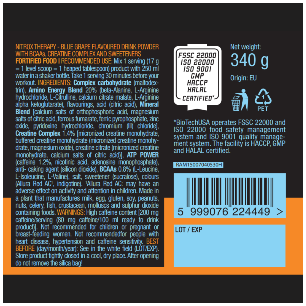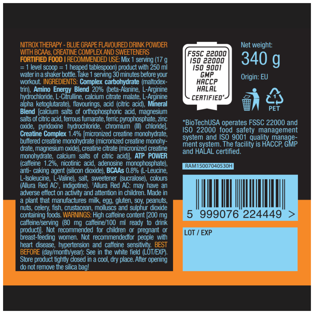 Main ingredients: BCAA, caffeine, creatine, formulation: powder