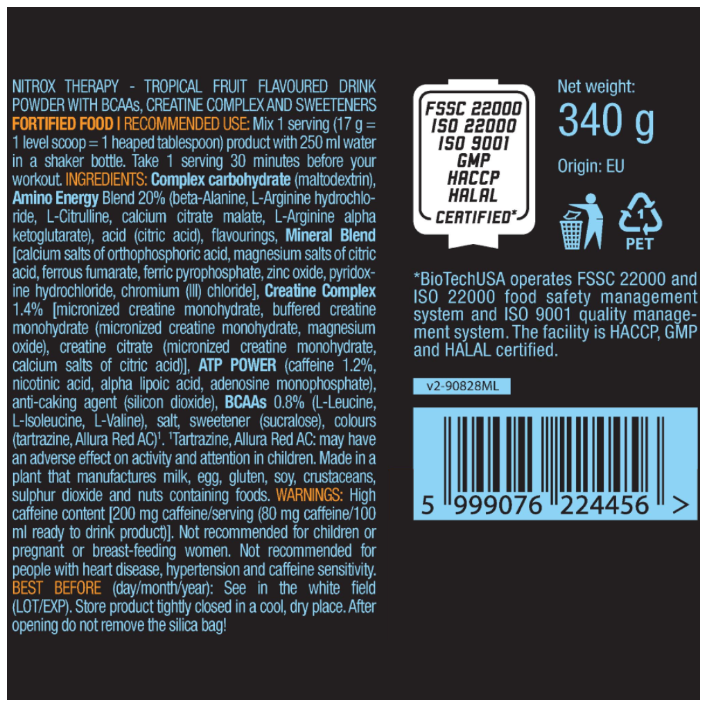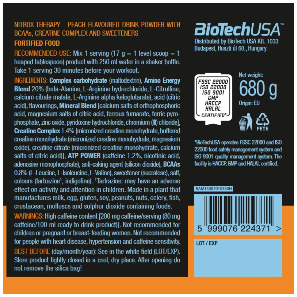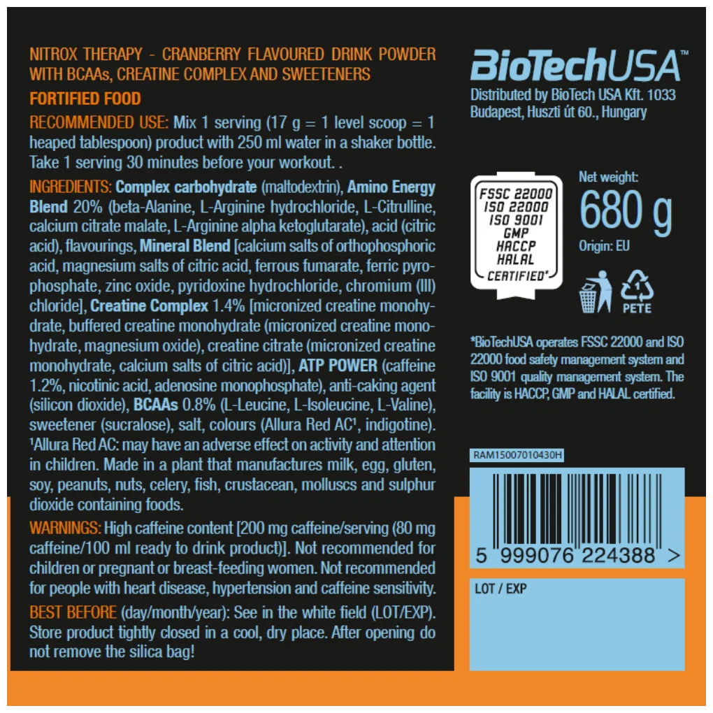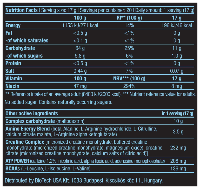 Suggested Use: Mix one serving of 17 g = 1 level scoop with 250 ml of water; drink one serving 30 minutes before training; composition: CARBORADE dextrose, maltodextrin, fructose, ribose, NOx NRG Pump L-arginine, calcium