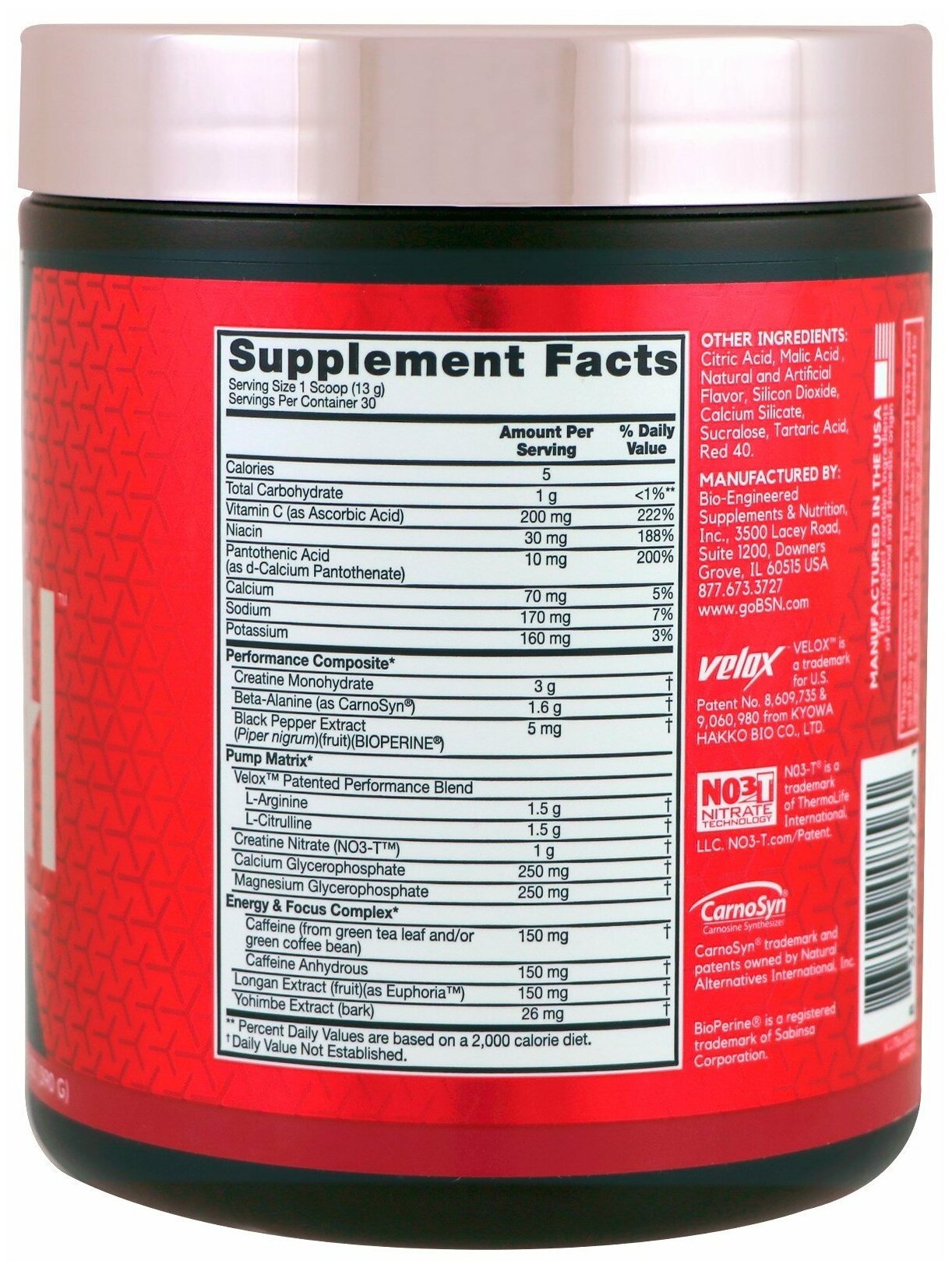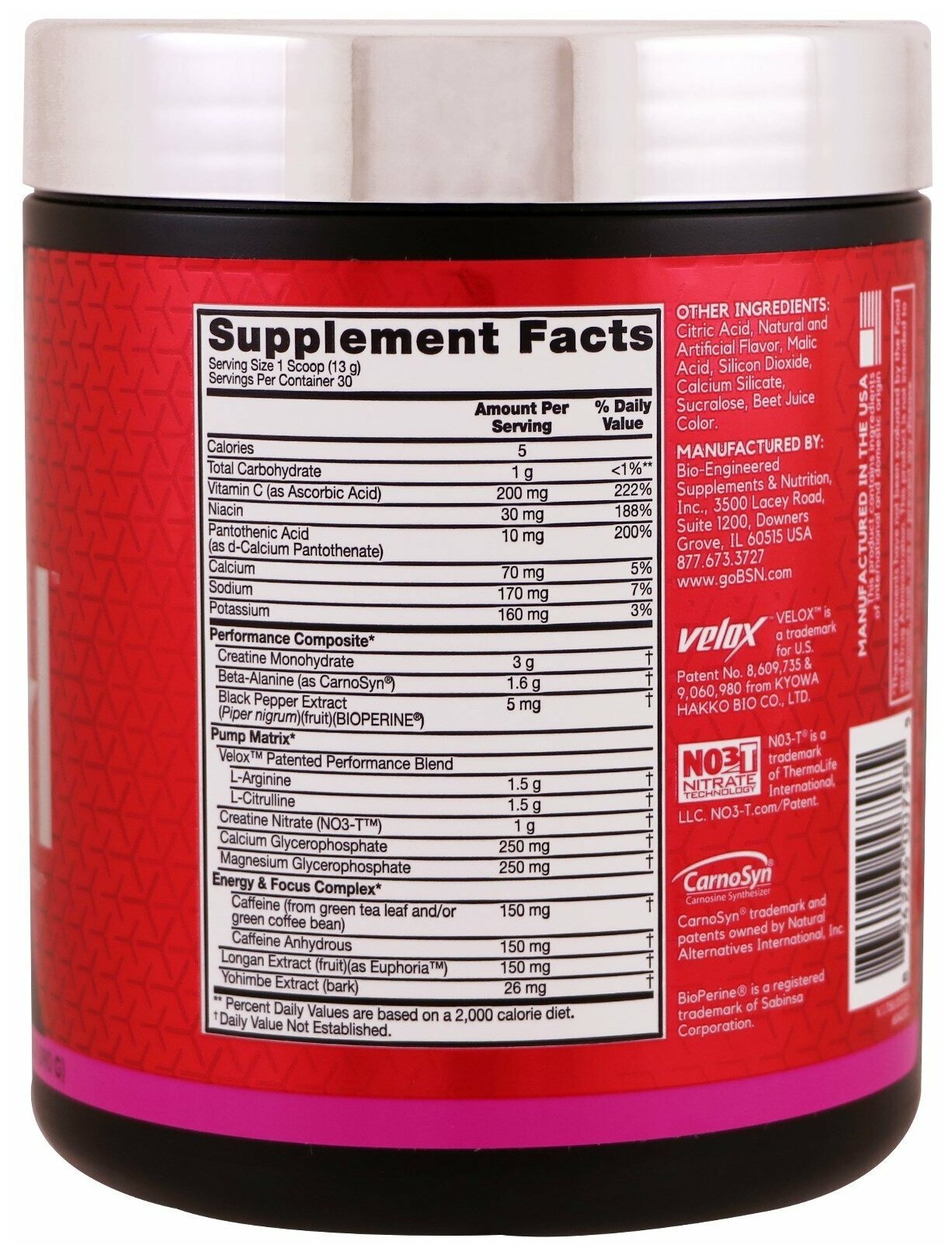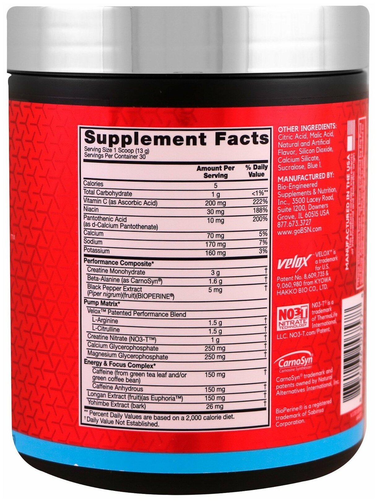 30 servings per pack; naturally and artificially flavored; patented pumping technology; purpose: to increase energy, productivity and concentration; composition: creatine monohydrate, beta-alanine, L-