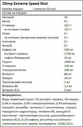 Purpose: weight loss / drying, endurance; recommendations for use: Just before training, one ampoule.; composition: water, guarana extract, taurine, L-tyrosine, glucuronolactone, vitamins, caffeine, citric acid