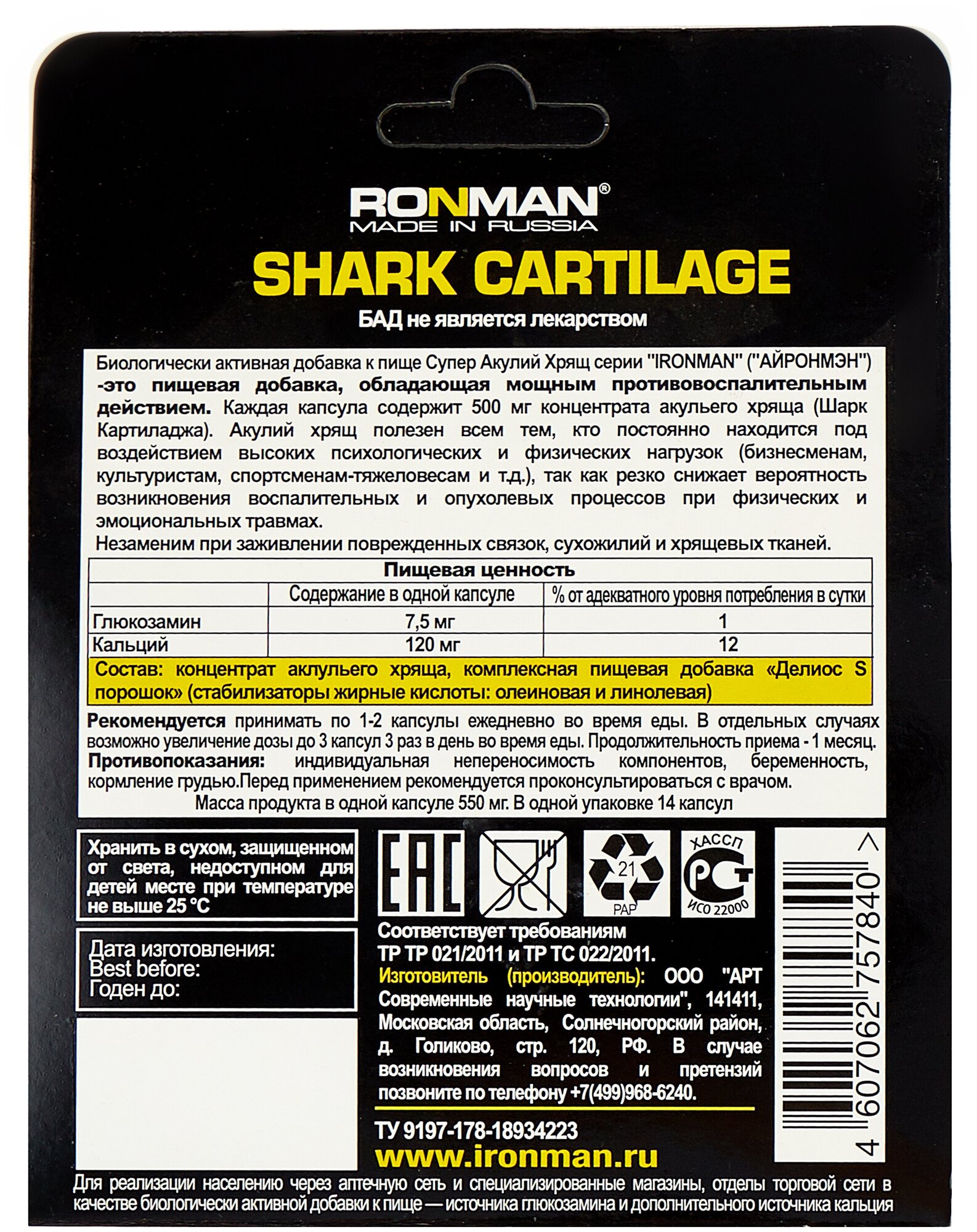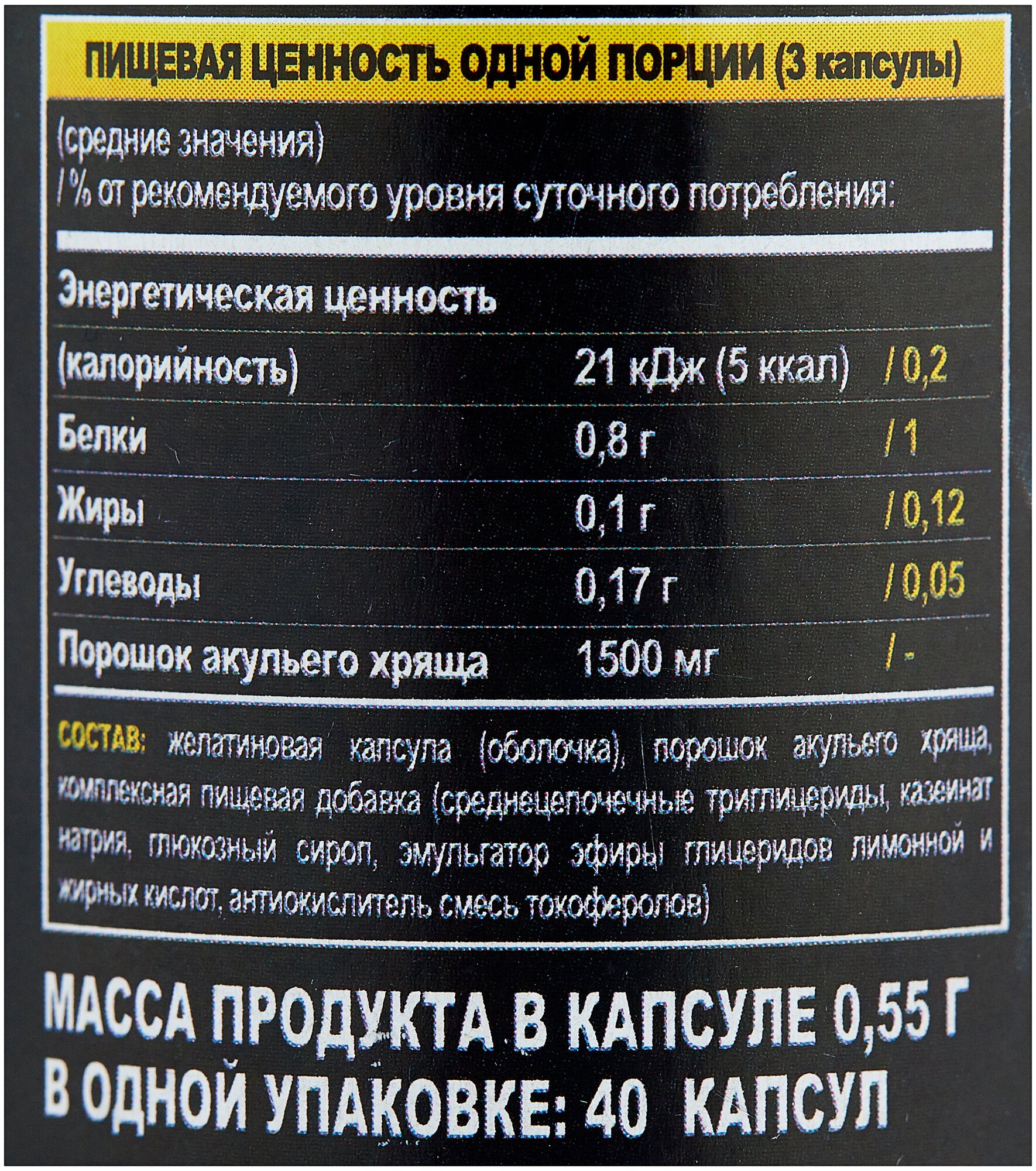 Main ingredient: shark cartilage, dosage form: capsules/tablets, for whom: for women, for men, purity: complex, dietary features: lactose-free