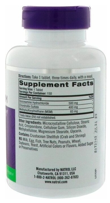Glucosamine, chondroitin sulfate, methylsulfanyl methane, cellulose, stearic acid, cellulose gum, silicon dioxide, methylcellulose, magnesium stearate, glycerin.