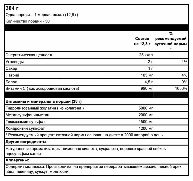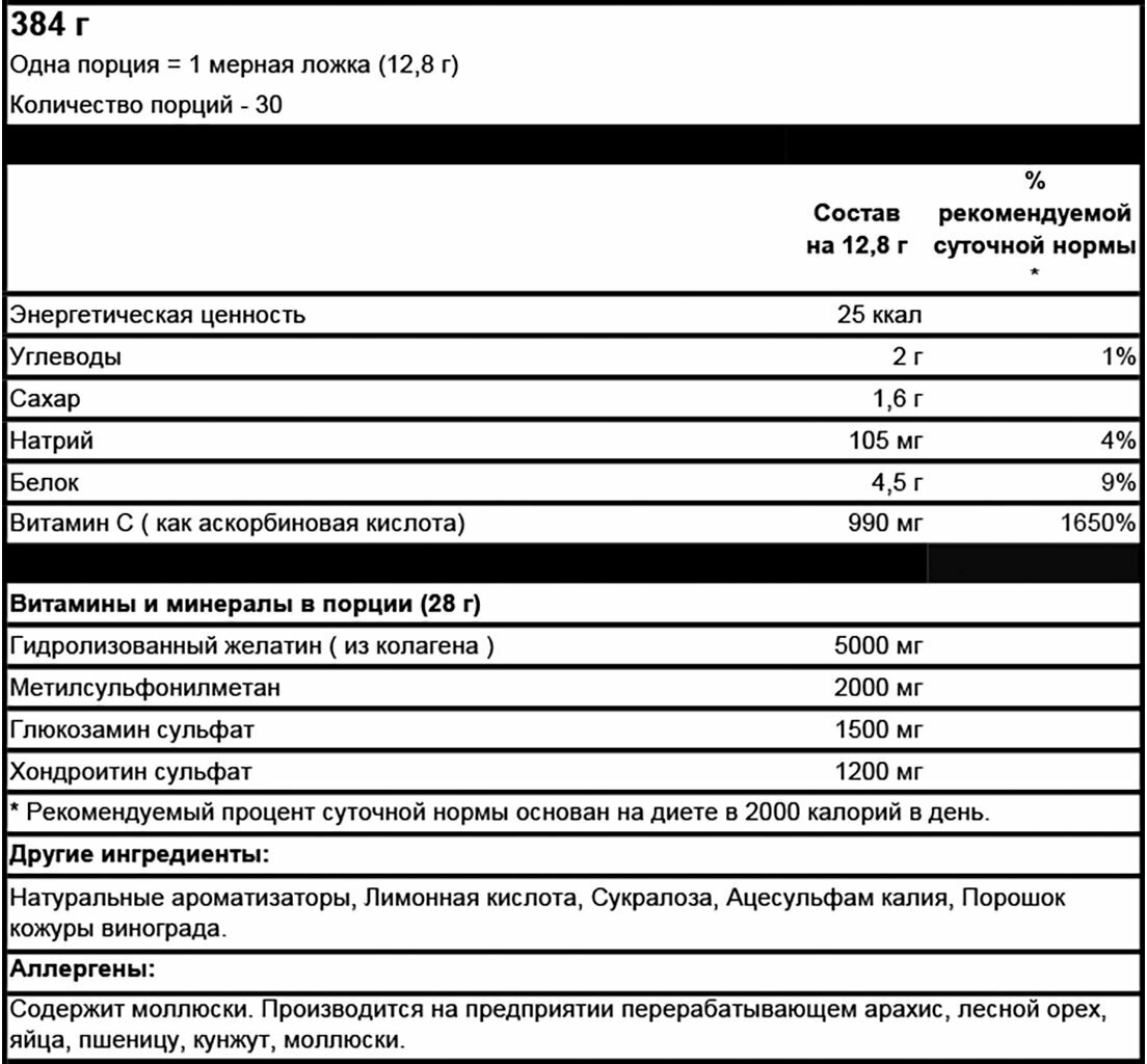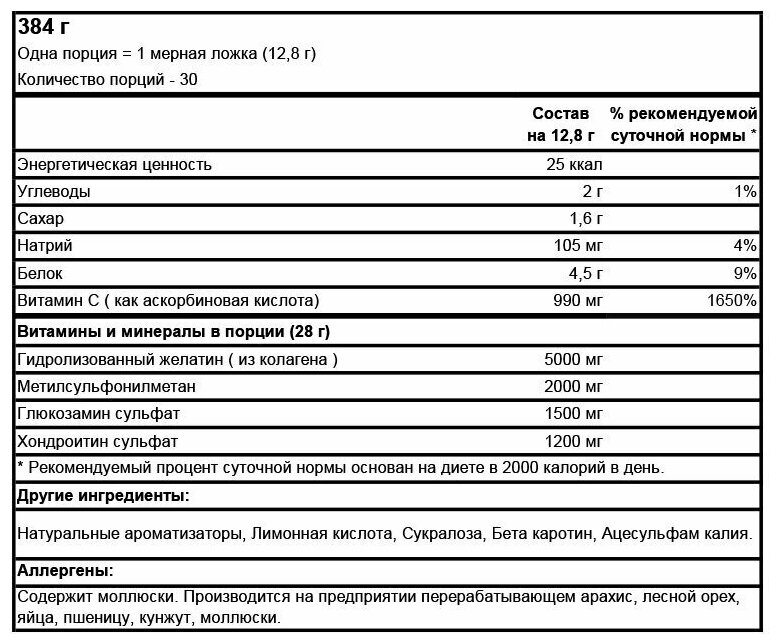 Main ingredient: MCM, glucosamine, gelatin, chondroitin, product form: powder, for whom: for women, for men, for women, for men, purity: complex, dietary features: without sugar, chlorine