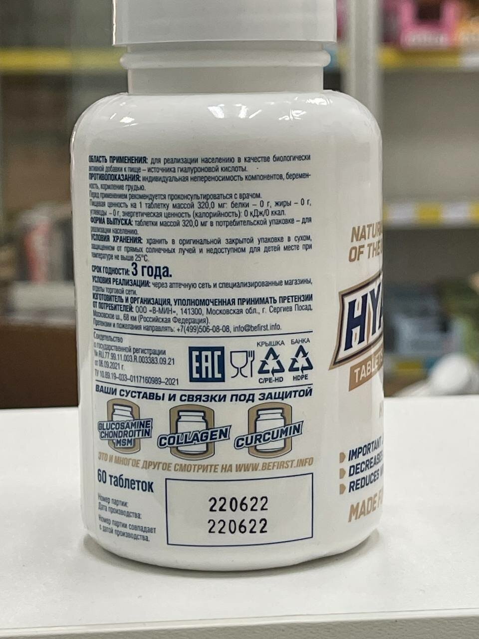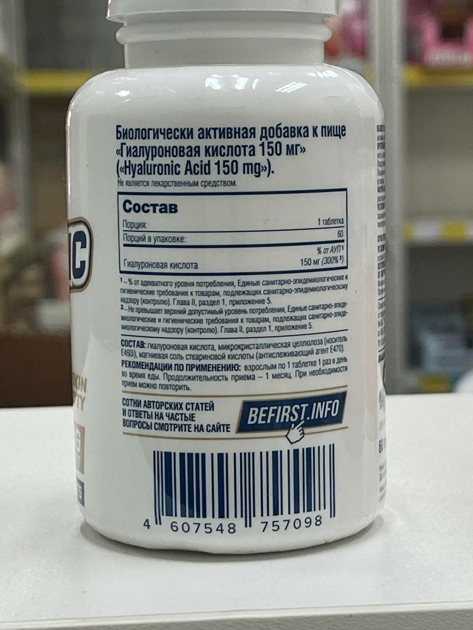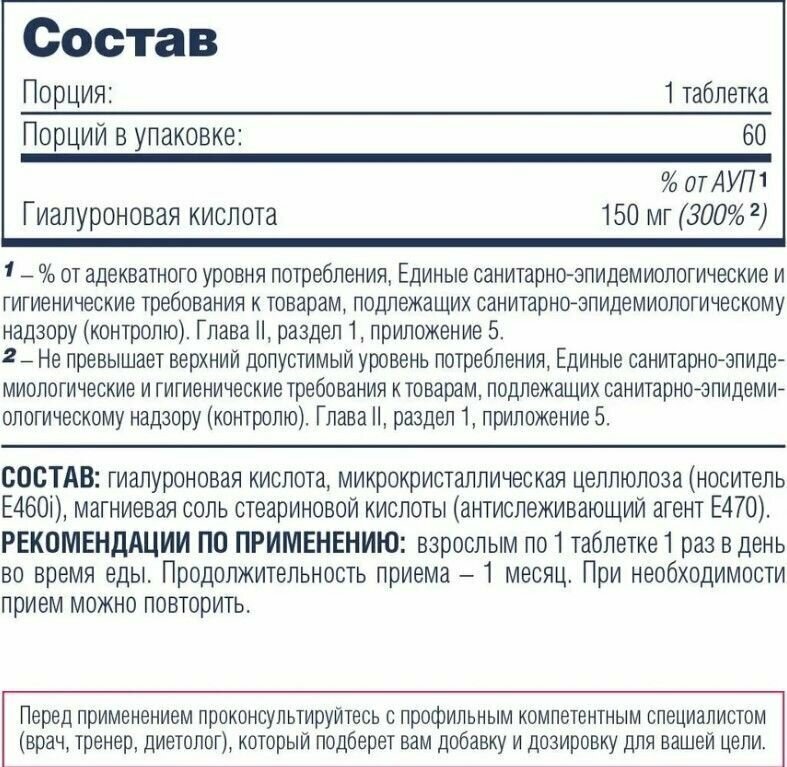 Composition per serving 1 tablet: hyaluronic acid - 150 mg; composition: hyaluronic acid, microcrystalline cellulose carrier E460i, magnesium salt of stearic acid, anti-caking agent E470