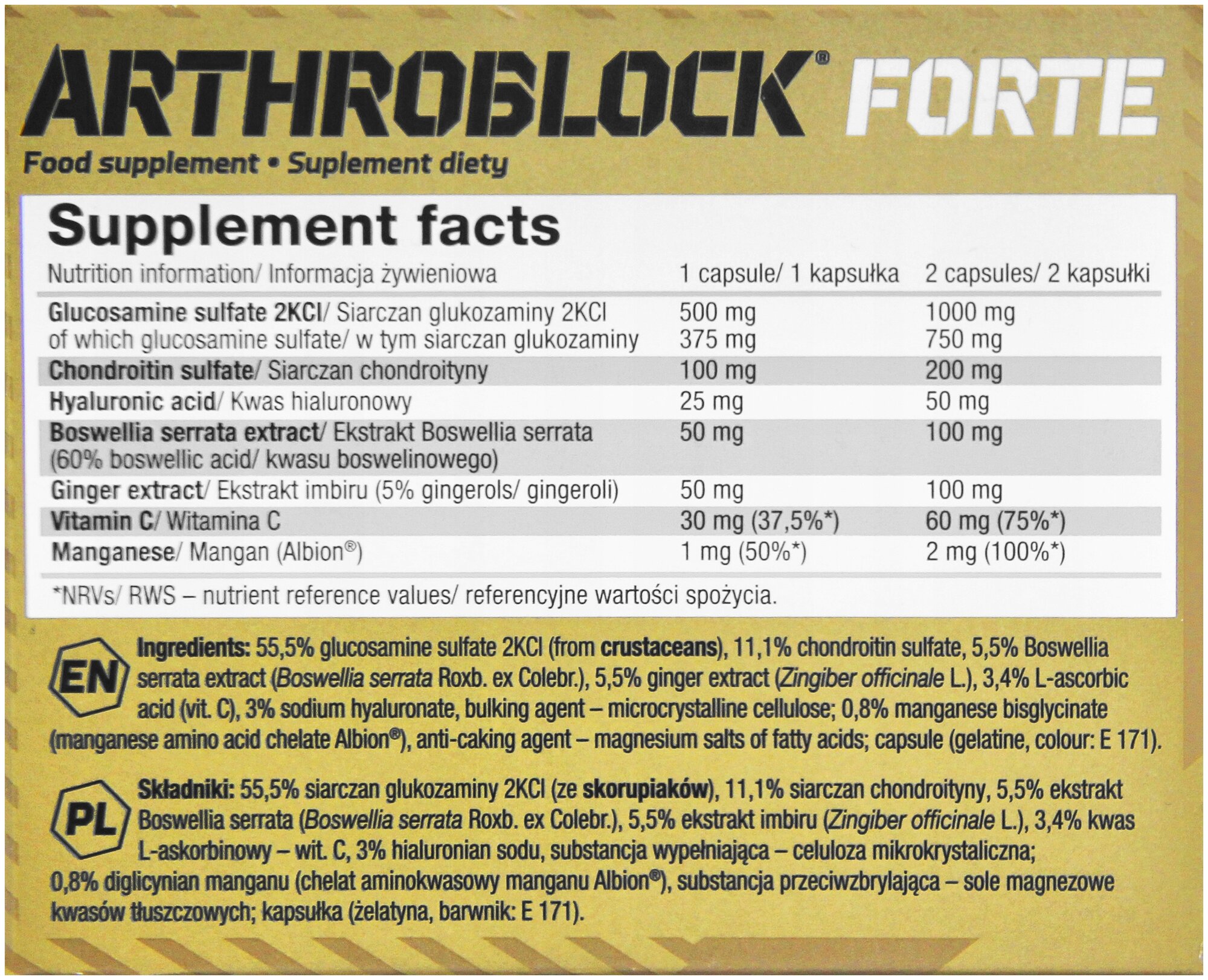 55.5% glucosamine sulfate 2KCl, 11.1% chondroitin sulfate, 5.5% Boswellia extract, 5.5% ginger root extract, 3.3% L-ascorbic acid, 2.7% sodium hyaluronate, manganese bisglycinate amino acid chelate manganese ALBION® - 6.25 mg, in t