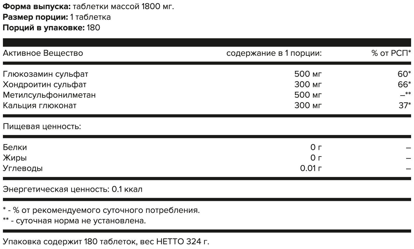 Recommendations for use: take 1 tablet 3 times a day 30 minutes before meals with water; composition: glucosamine sulfate, chondroitin sulfate, methylsulfonylmethane, calcium, microcrystalline cellulose, starch