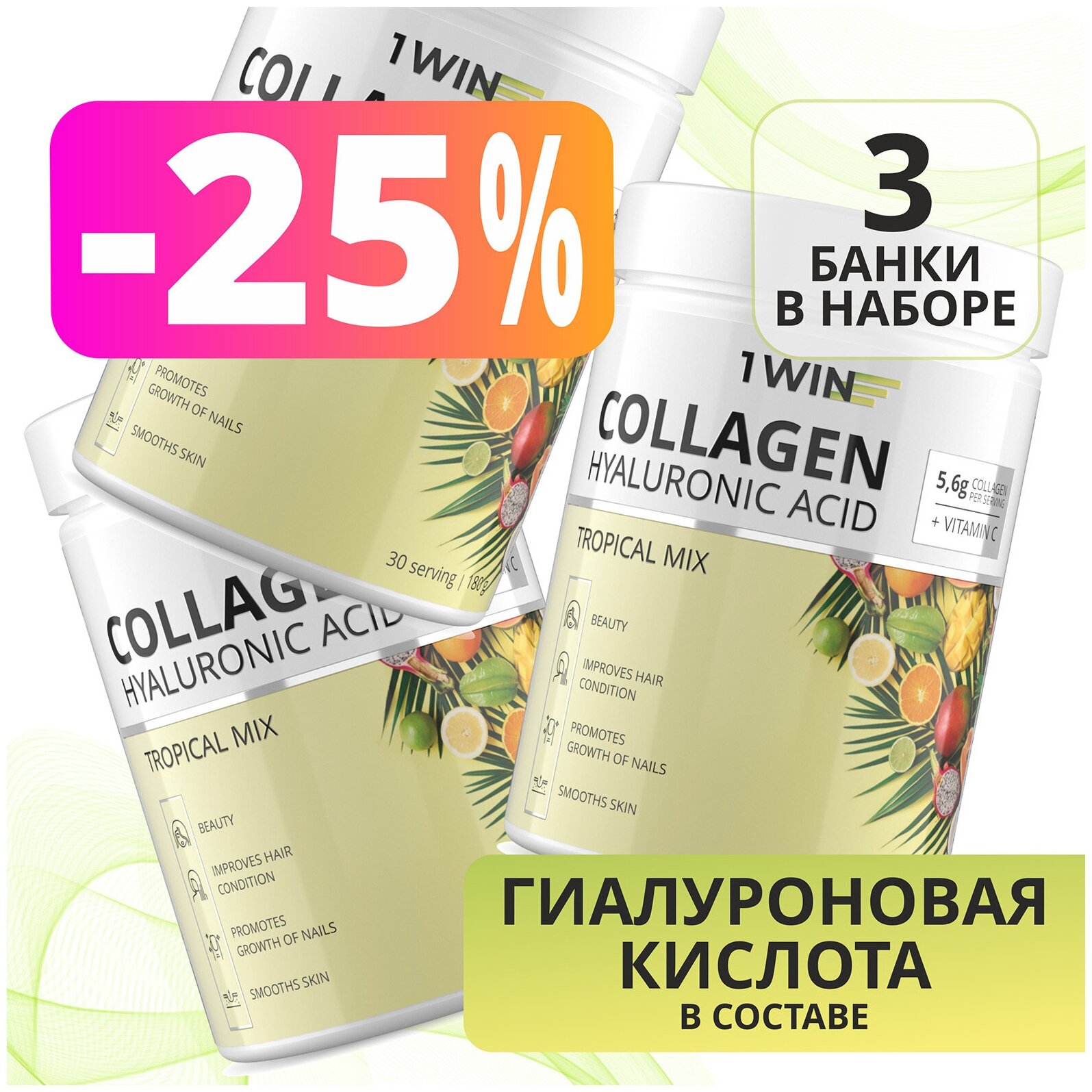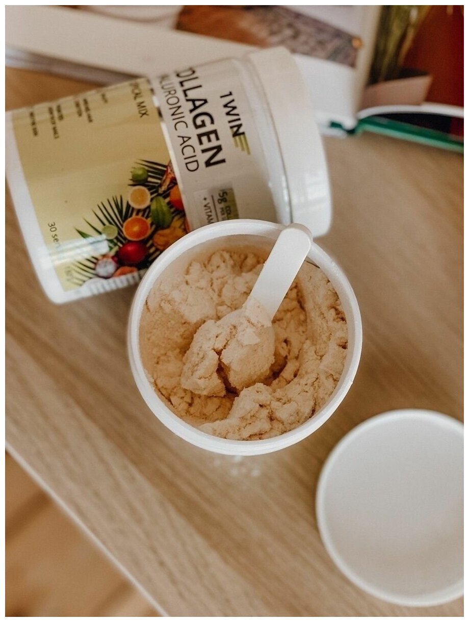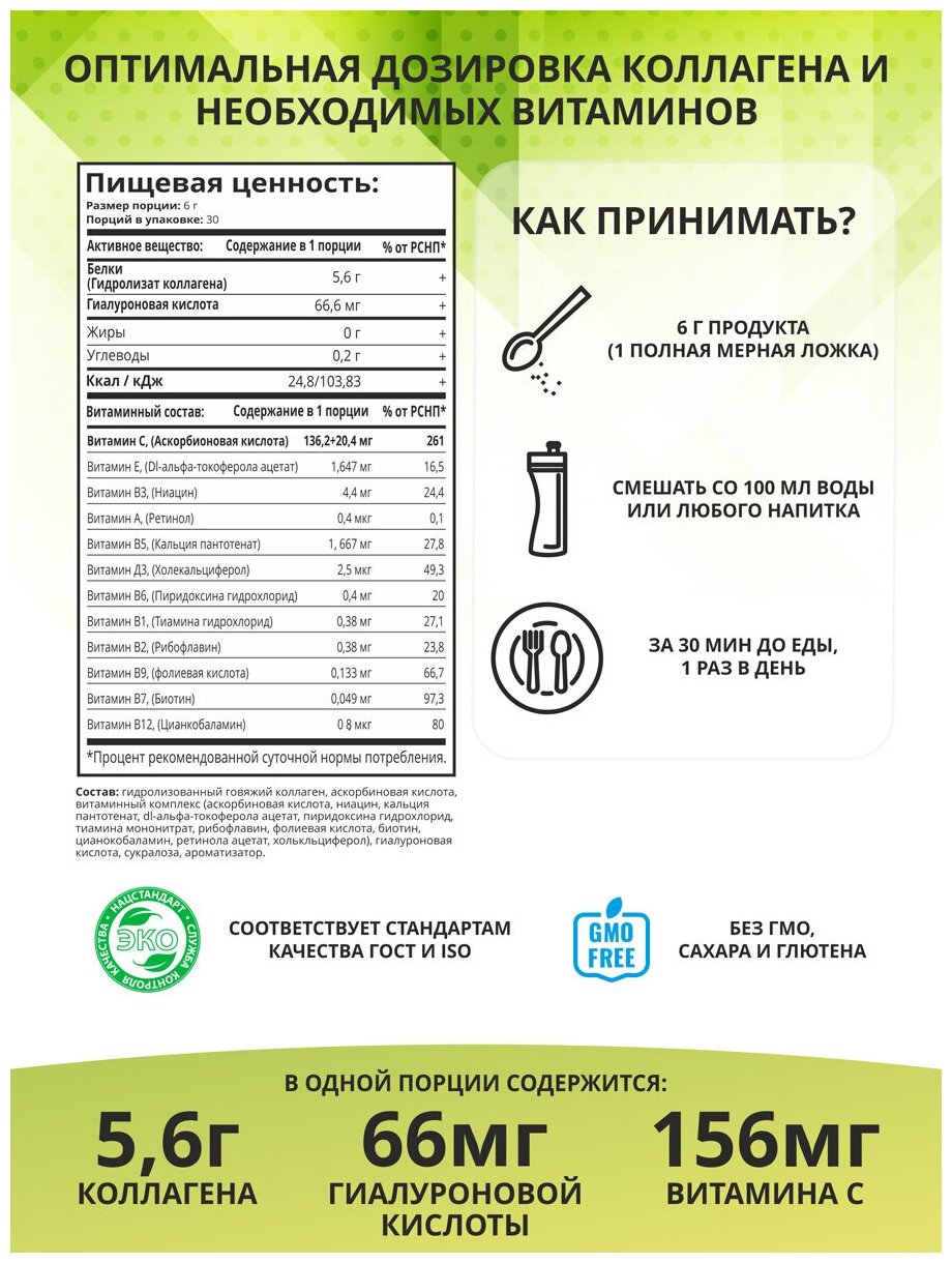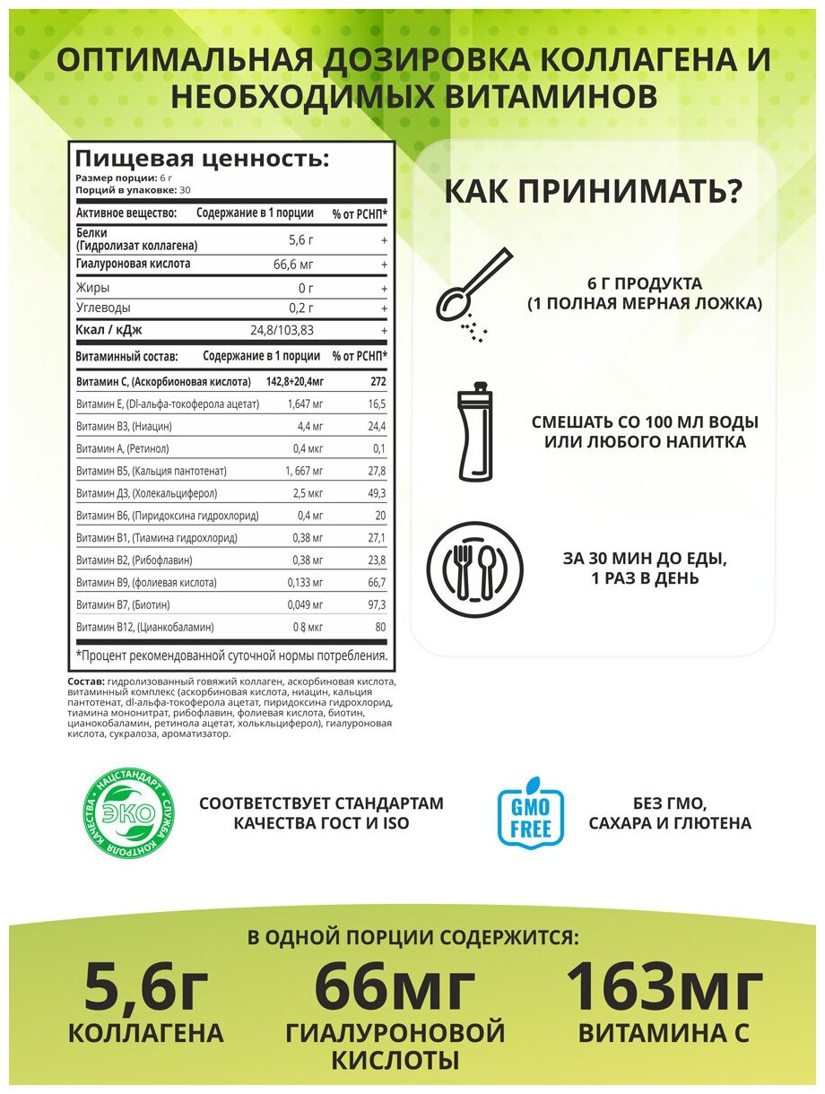 Hydrolyzed beef collagen, ascorbic acid, vitamin complex biotin, ascorbic acid, nicotinic acid, tocopherol, pantothenic acid, cyanocobalamin, pyridoxine, thiamine, retinol, riboflavin,