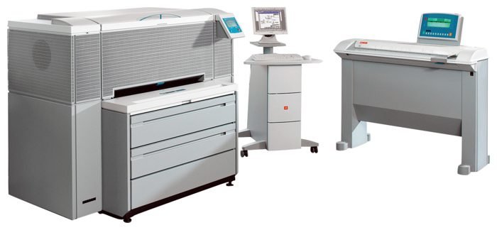 Modular multitasking system for printing, copying and scanning large format documents; Oce Copy Press printing technology; printing speed 8 m/min 6A0/min; print formats A4 portrait - A0; maximum: 0.914x15 m; By