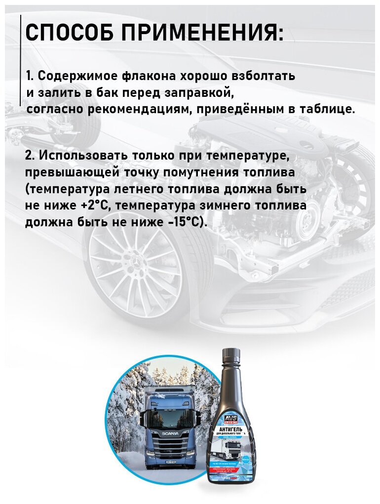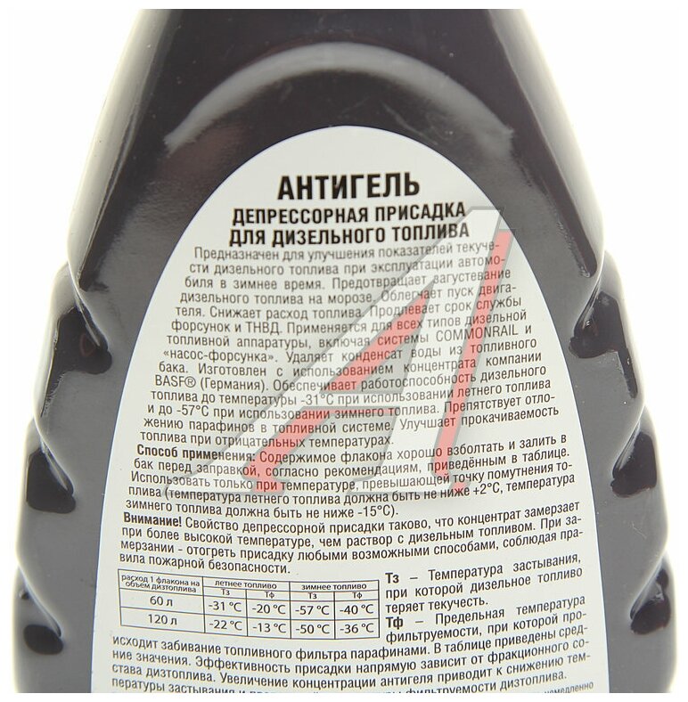 Shake the contents of the bottle well and pour into the tank before refueling; use only at temperatures above the cloud point of the fuel; the temperature of summer fuel must not be lower than +2°С;