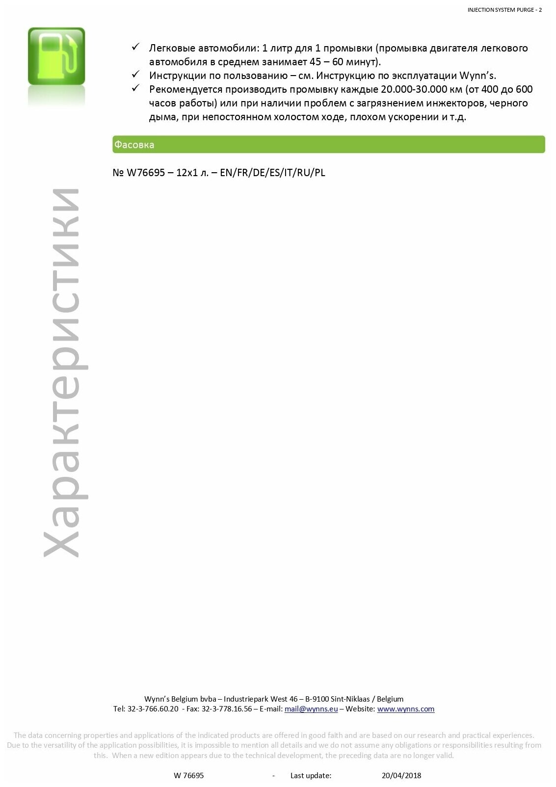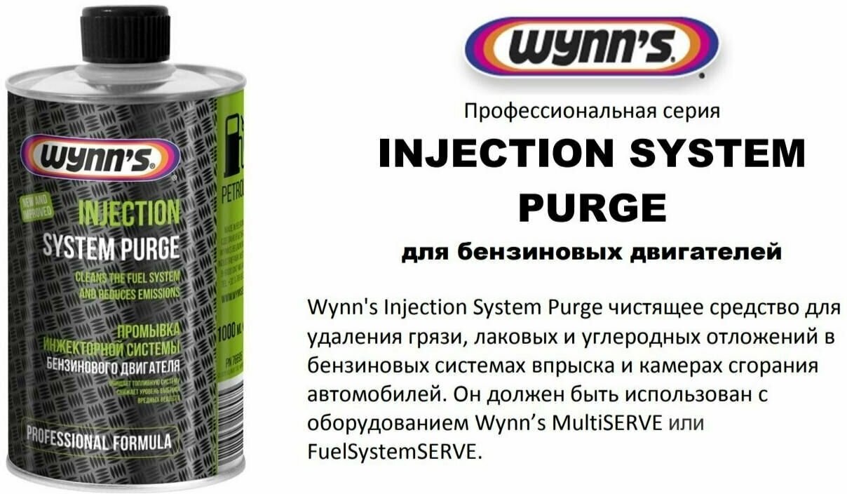 It is recommended to clean every 20,000 - 30,000 km or when problems arise: intermittent idle, poor throttle response; apply only with Wynn's RCP, FuelSystemServe, FuelServe, or EnviroPurge units; processing time