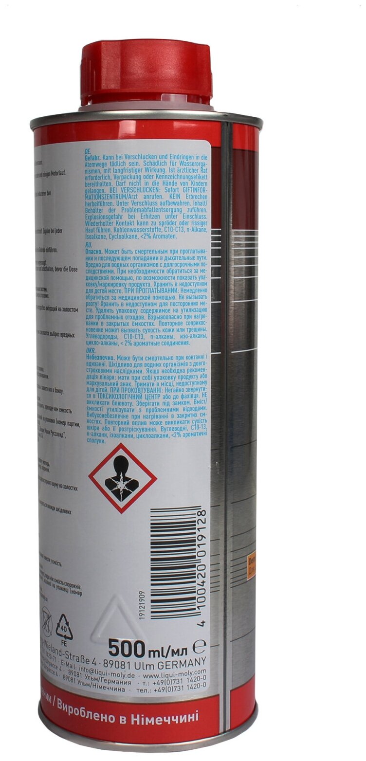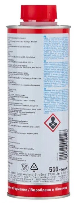 Preventive use: add an additive at the rate of 1 bottle per 75 liters of fuel. It is recommended to use the product every 3000 km. Mixing with fuel occurs independently. Fuel system cleaning: disconnect