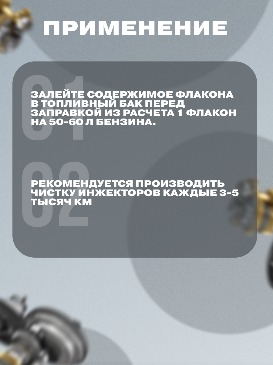 Pour the contents of the bottle into the fuel tank before refueling at the rate of 1 bottle for 50-60 liters of gasoline