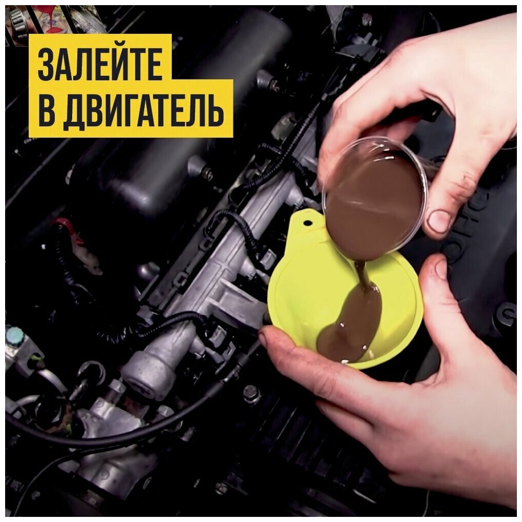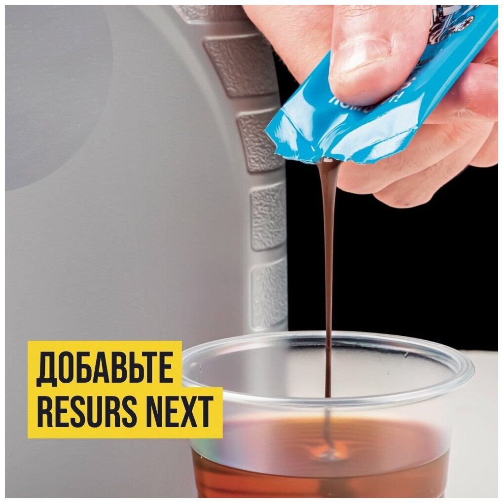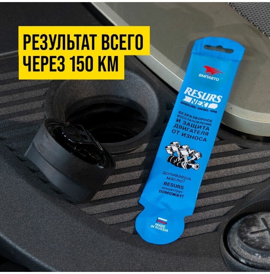 Warm up and turn off the engine; mix 150-200 ml of pure oil with the contents of the RESURS Next package; pour the mixture into the oil filler neck; start moving; the effect will appear after 150 km of run