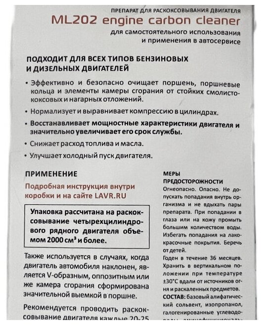 Auto products Engine decoking fluid LAVR ML-202, for engines over 2 liters, 330 ml