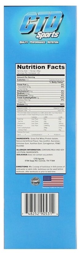 Ingredients: whey protein isolate, natural and artificial flavor, cocoa powder, soy lecithin, sucralose, salt, cellulose gum, xanthan gum, carrageenan
