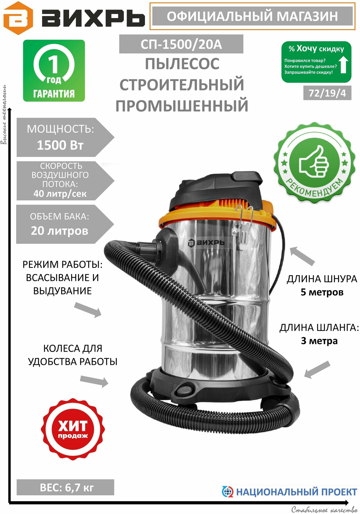 Type: professional vacuum cleaner, cleaning type: wet, dry, power: 1500 W, dust container type: bag, tank/dust container volume: 20 l, filter cleaning system: manual, vacuum: 195 mbar, air consumption: 40 l/s, hose length: 1.80 m