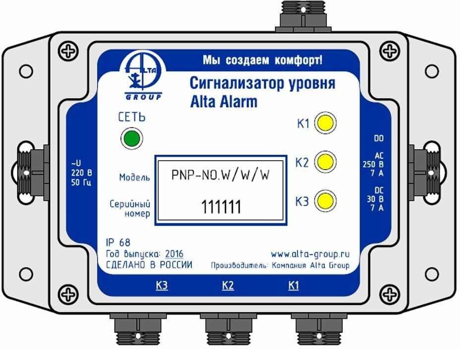 Complete set: signaling device Alta Alarm – 1 piece; Alta Sensor – 3 pcs.; signaling device power cable 5 m - 1 pc.; external alarm cable 5m – 1 pc.