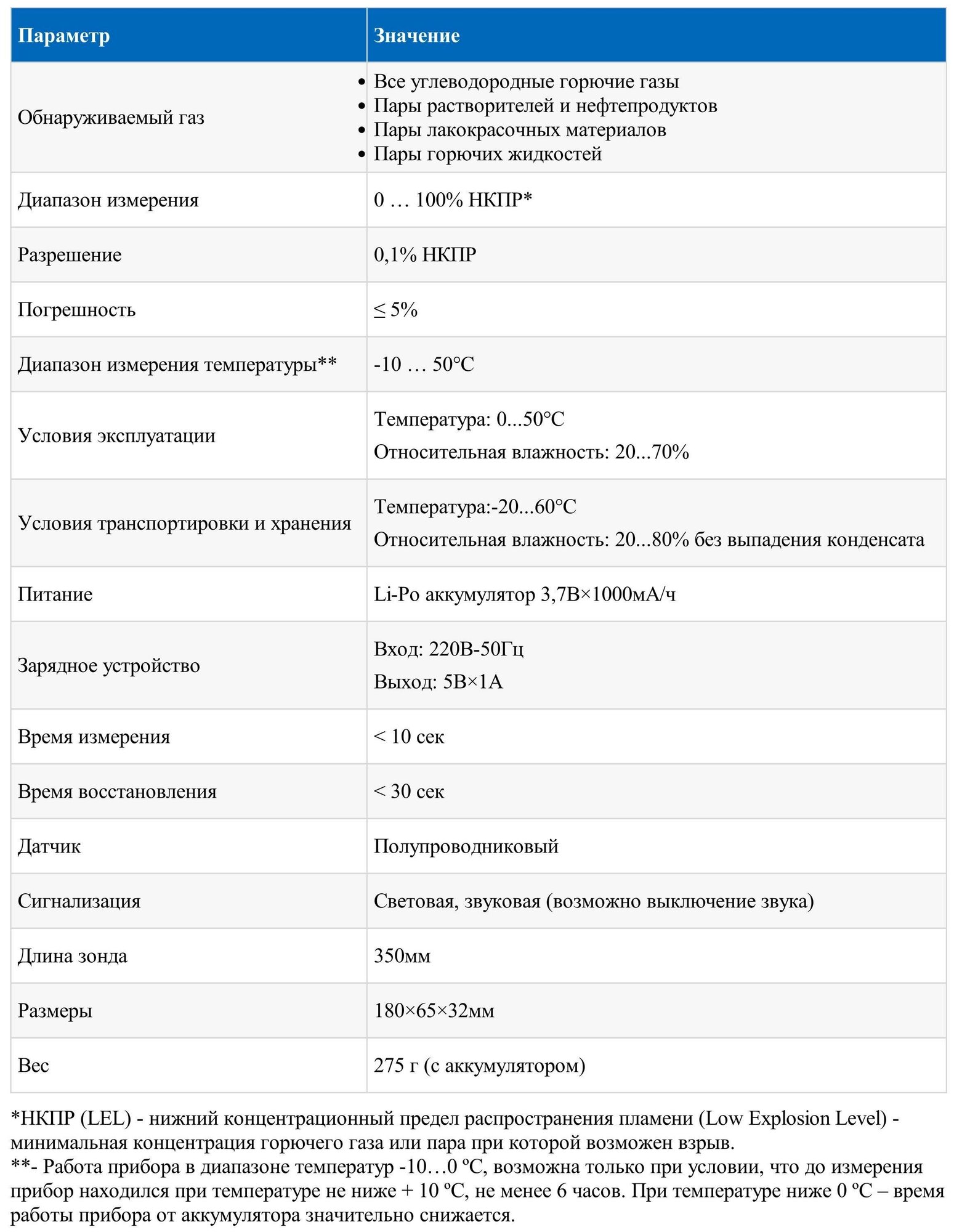 Type: gas analyzer, power source: accumulator, From accumulator, device: electronic, functions: auto-shutdown, beep, overload indicator, low battery indicator, display