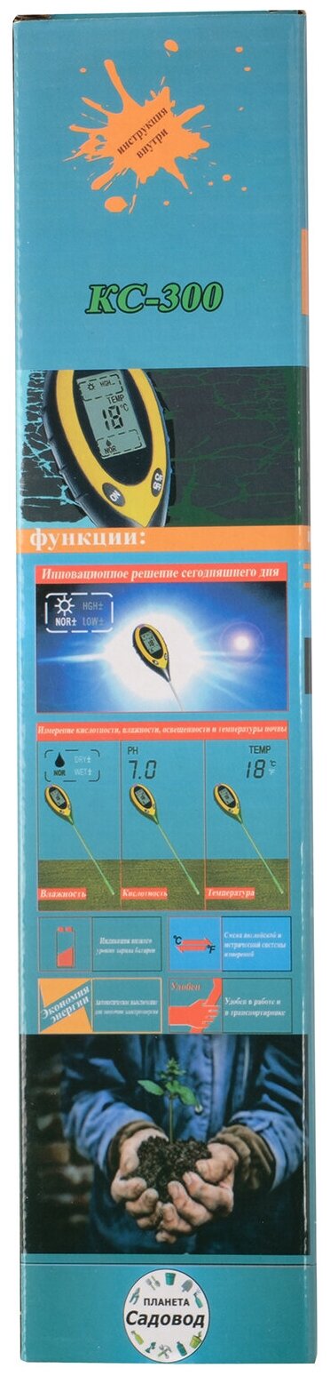 PH range: 3.4 to 9.0; moisture levels: 1 dry to 5 very wet soil; sunlight levels: 1 to 9; temperature range: -9 to +50°С; power supply: 9 V battery, Krona type; electrode diameter: 5 mm, length: 200 mm