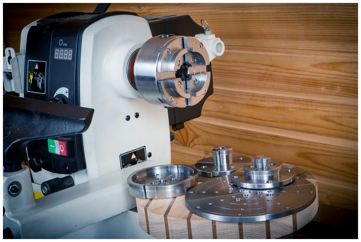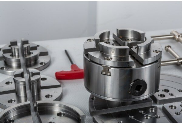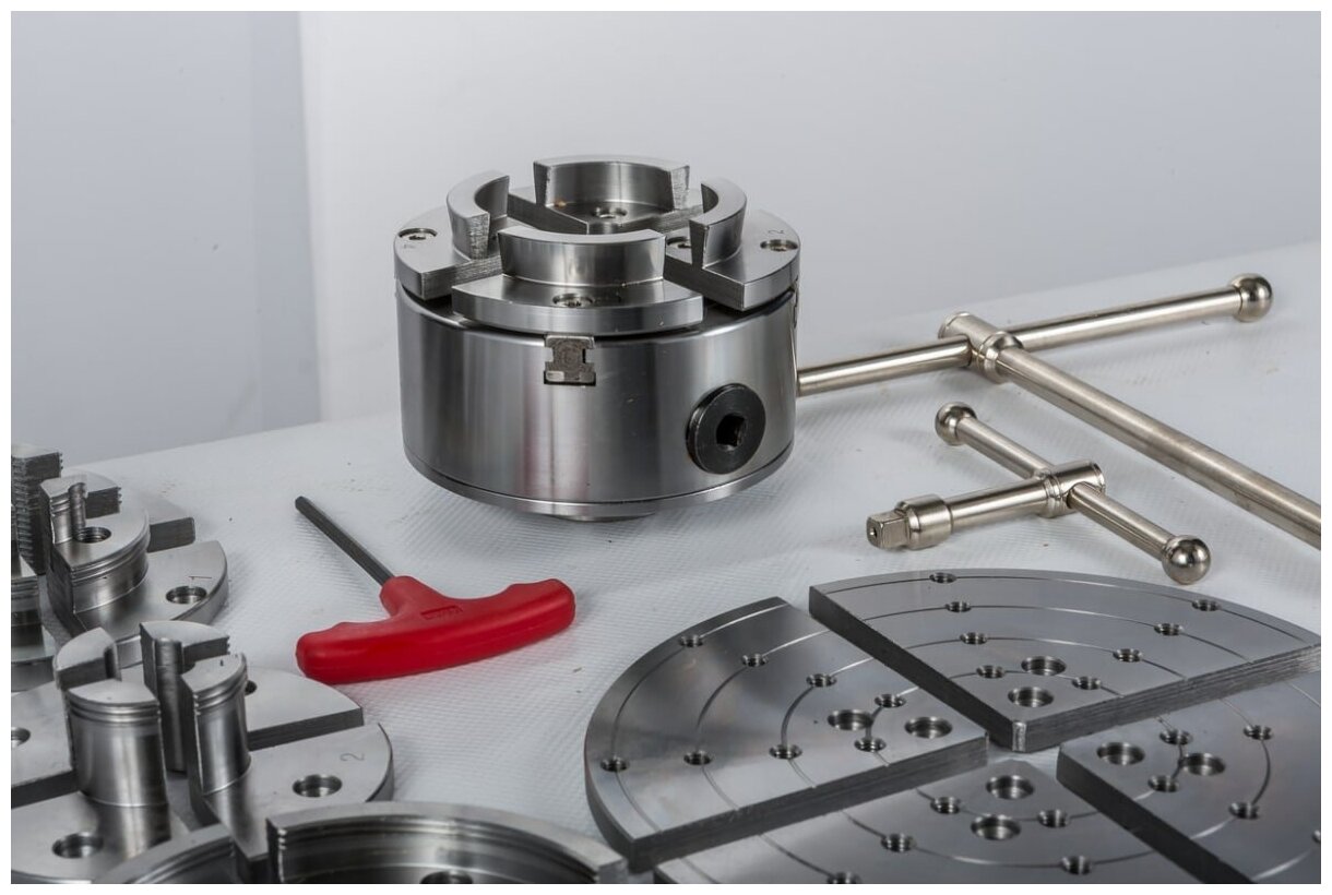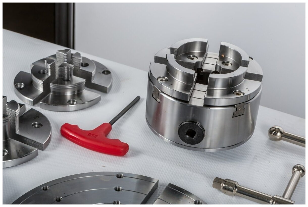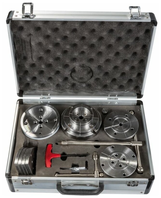 Included lathe chuck diameter 114 mm, connecting thread M33x3.5, set of interchangeable jaws 4 pcs., clamping key for a square, dividing device on the chuck, screw insert, hex key, case