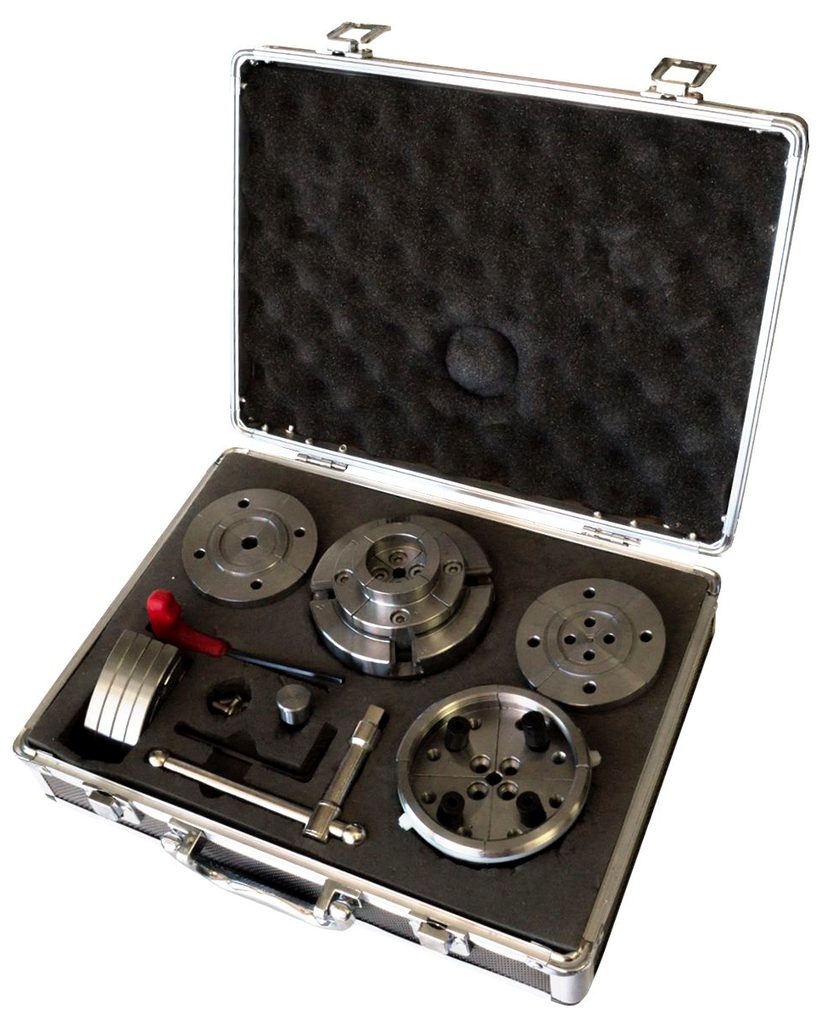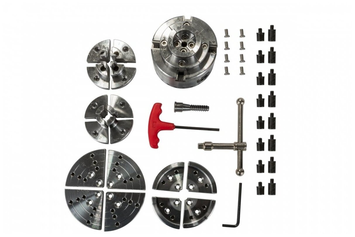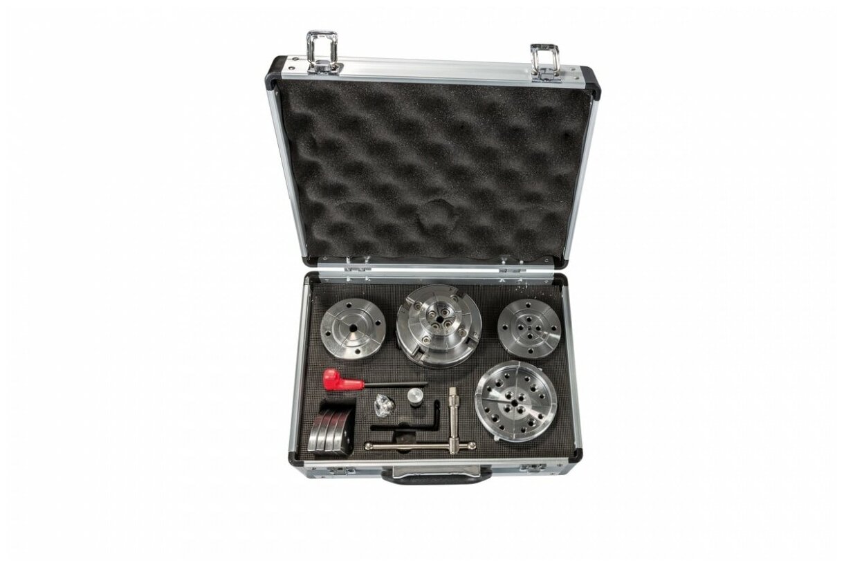 Included lathe chuck diameter 95 mm, connecting thread M33x3.5, set of interchangeable jaws, clamping key for a square, dividing device on the chuck, screw insert, hex key, case