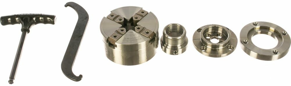 Includes standard 50mm jaws, 87mm faceplate, allen key, SC4 hex wrench and right hand screw