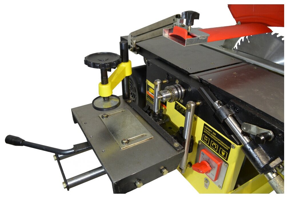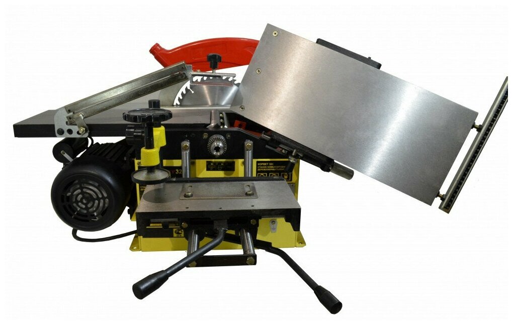 Processing material: wood, functions performed: sawing, cutting, drilling, milling, type: machine, placement: desktop, operating principle: mechanical, mains voltage: 220 V, working position: horizontal