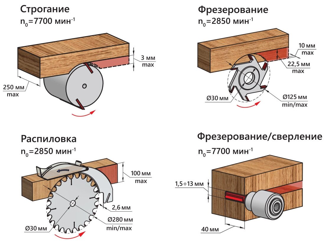 Processing material: wood, functions performed: sawing, cutting, drilling, milling, jointing, type: machine, placement: desktop, operating principle: mechanical, mains voltage: 230 V, working position: