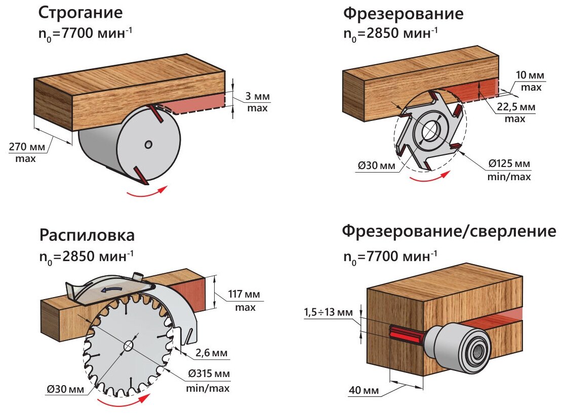 Functions performed: Sawing, cutting, drilling, milling, jointing