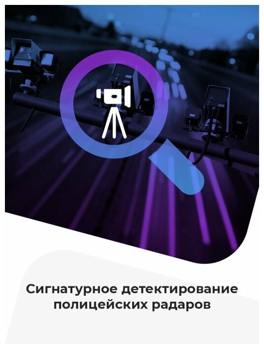 Radar detection: Robot, Avtodoria, Cordon, Arrow, Instant-On support, POP support, signature analysis, City mode, Highway mode