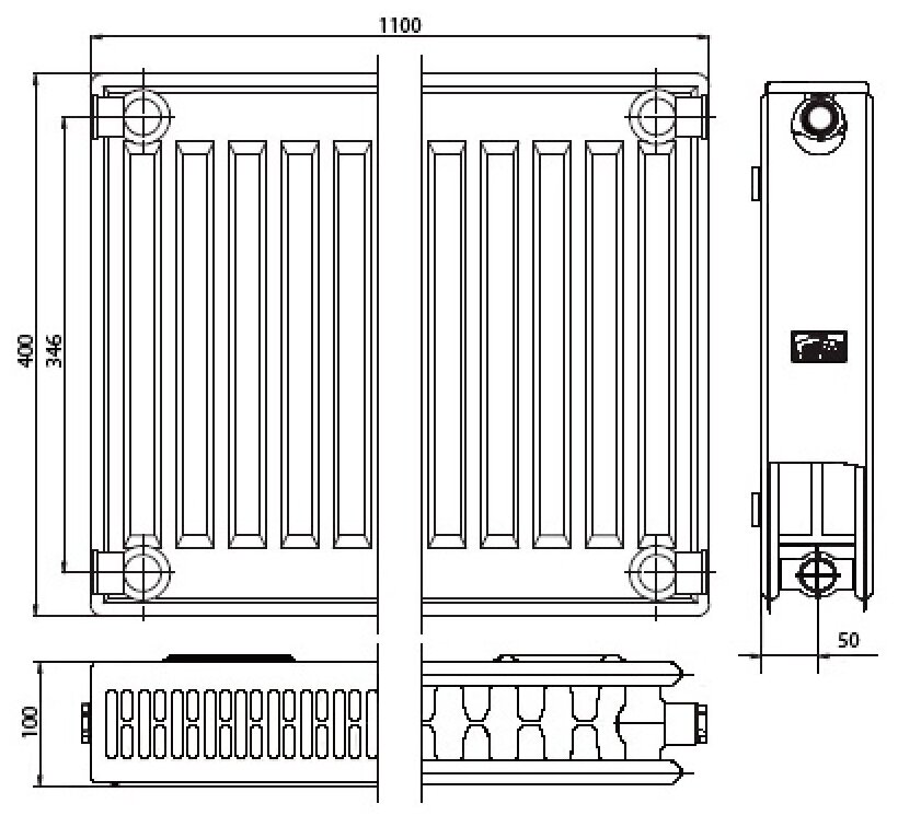 Material: steel, construction: wall-mounted, spacing: 346 mm, thickness: 100 mm, type: panel, mounting kit