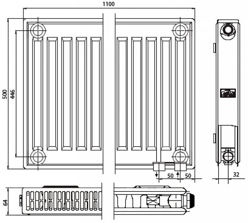 Material: steel, construction: wall-mounted, spacing: 446 mm, thickness: 64 mm, type: panel, mounting kit